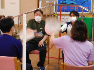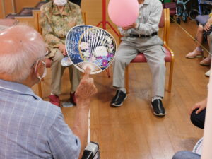 名付けて『織姫★彦星2人で力合わせて風船仰ぎゲーム』利用者様も一生懸命うちわで風船を